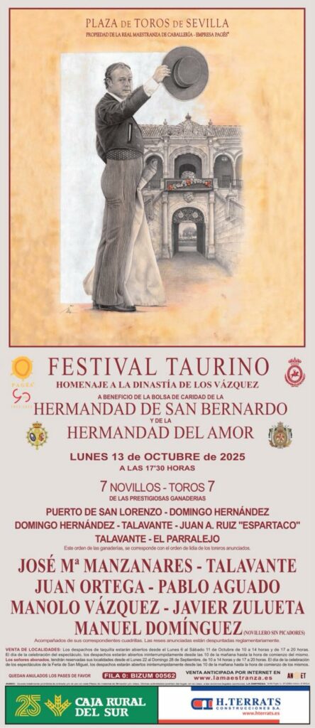 Ese día harán el paseíllo en el coso baratillero seis figuras del toreo y una joven promesa del torero sevillano. El cartel del festejo, que se ha presentado este miércoles 17 de septiembre en el Salón de los Carteles de la Real Maestranza de Caballería de Sevilla, está formado por José María Manzanares, Alejandro Talavante, Juan Ortega, Pablo Aguado, Manolo Vázquez, Javier Zulueta y el novillero sin picadores Manuel Domínguez. Los espadas lidiarán novillos de las ganaderías -en el mismo orden de lidia- de El Puerto de San Lorenzo, Domingo Hernández (2), Talavante, Juan A. Ruiz «Espartaco», Talavante y El Parralejo.